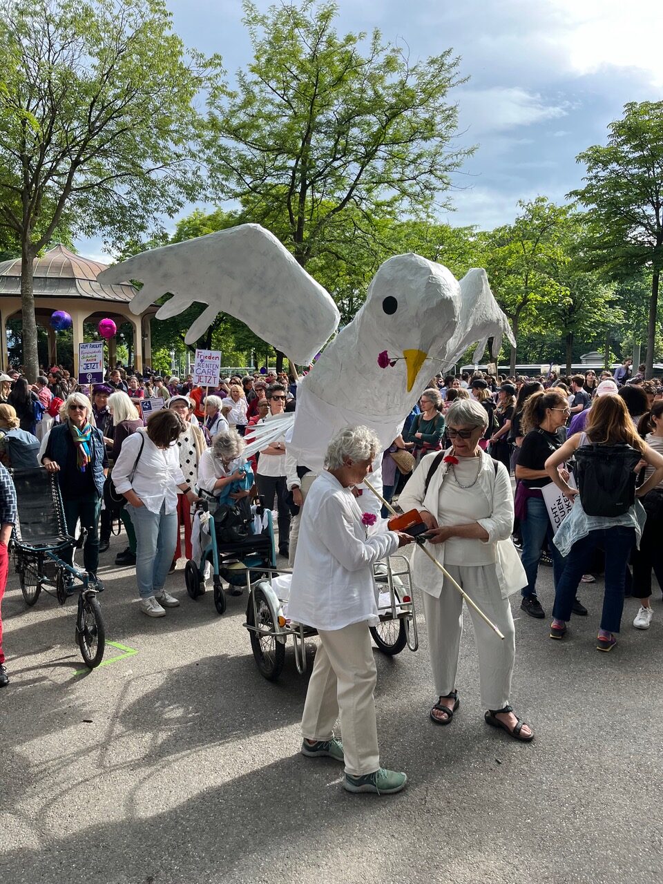 Fast zeitgleich mit der feministischen Demo vom 14. Juni gegen Krieg, Krise und Patriarchat fand die Bürgenstock-Konferenz statt. Die weisse Taube an der Demo symbolisierte ein anderes, ein feministisches Verständnis von Frieden – doch was verstehen wir unter Frieden, Gewalt- und Herrschaftsfreiheit? Alte Feministinnen von DOL & SOL werfen brisante Fragen auf und diskutieren sie. Interessierte Frauen jeden Alters sind herzlich willkommen.